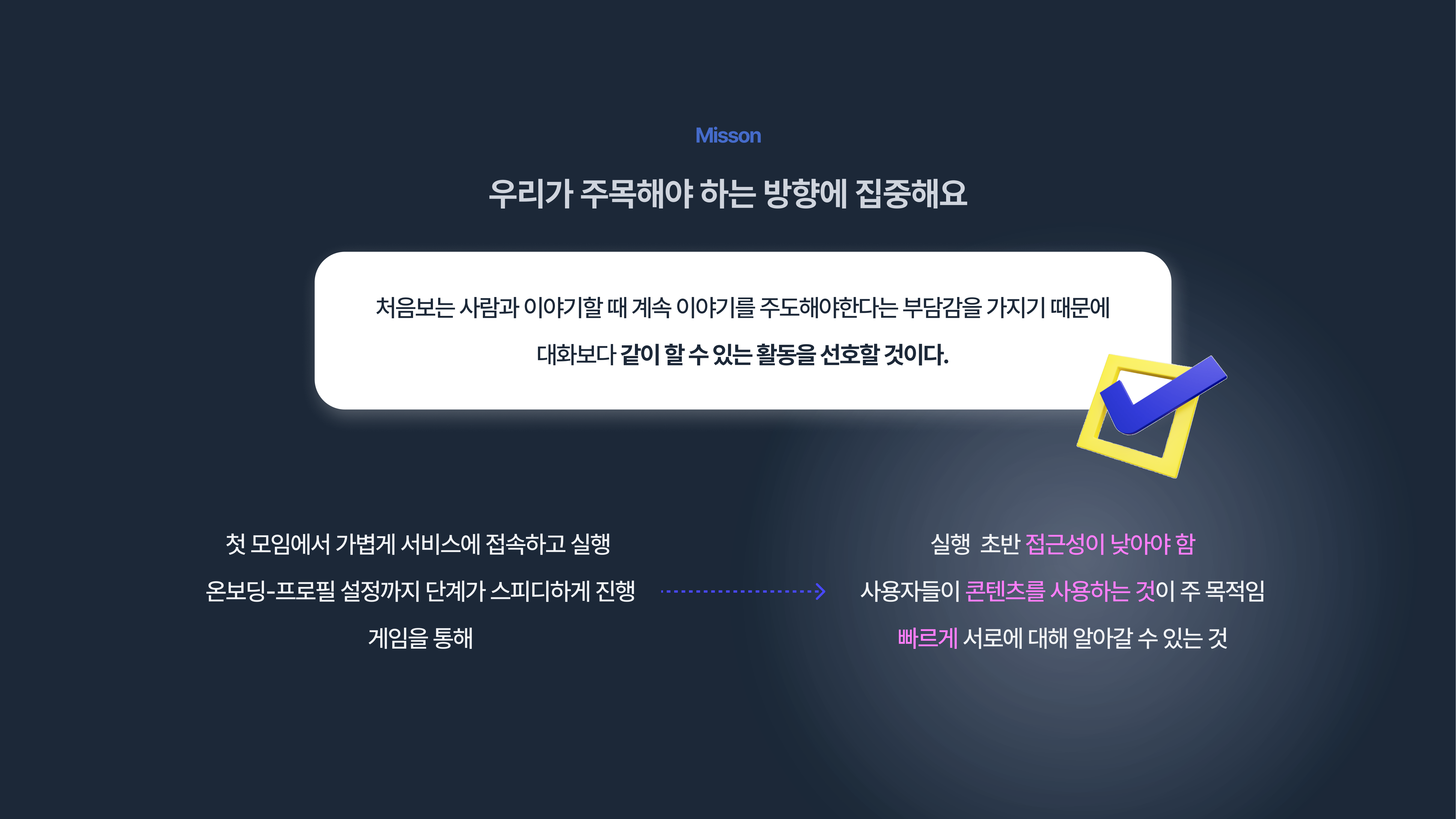 그렇게 선정된 아이디어는 “모임의 첫 5분을 책임진다” 라는 슬로건을 가진 아이스 브레이킹 서비스 였습니다.