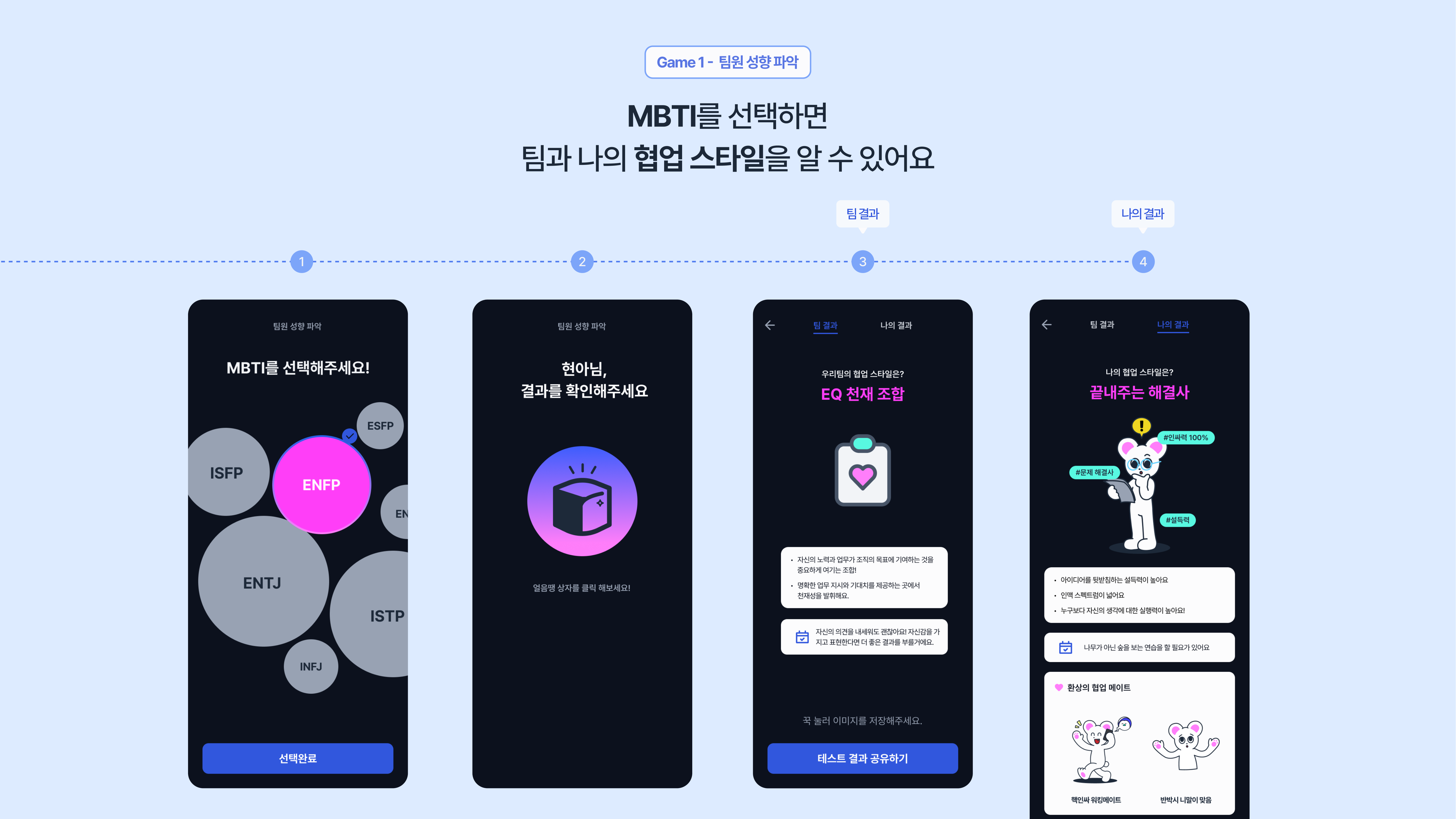 ‘팀원 성향 파악 게임’ 은 실시간으로 사용자의 MBTI 정보를 입력 받아 “나의 MBTI 별명” , “우리팀의 MBTI 조합/별명” , “MBTI 설명” 등을 확인 할 수 있습니다.
