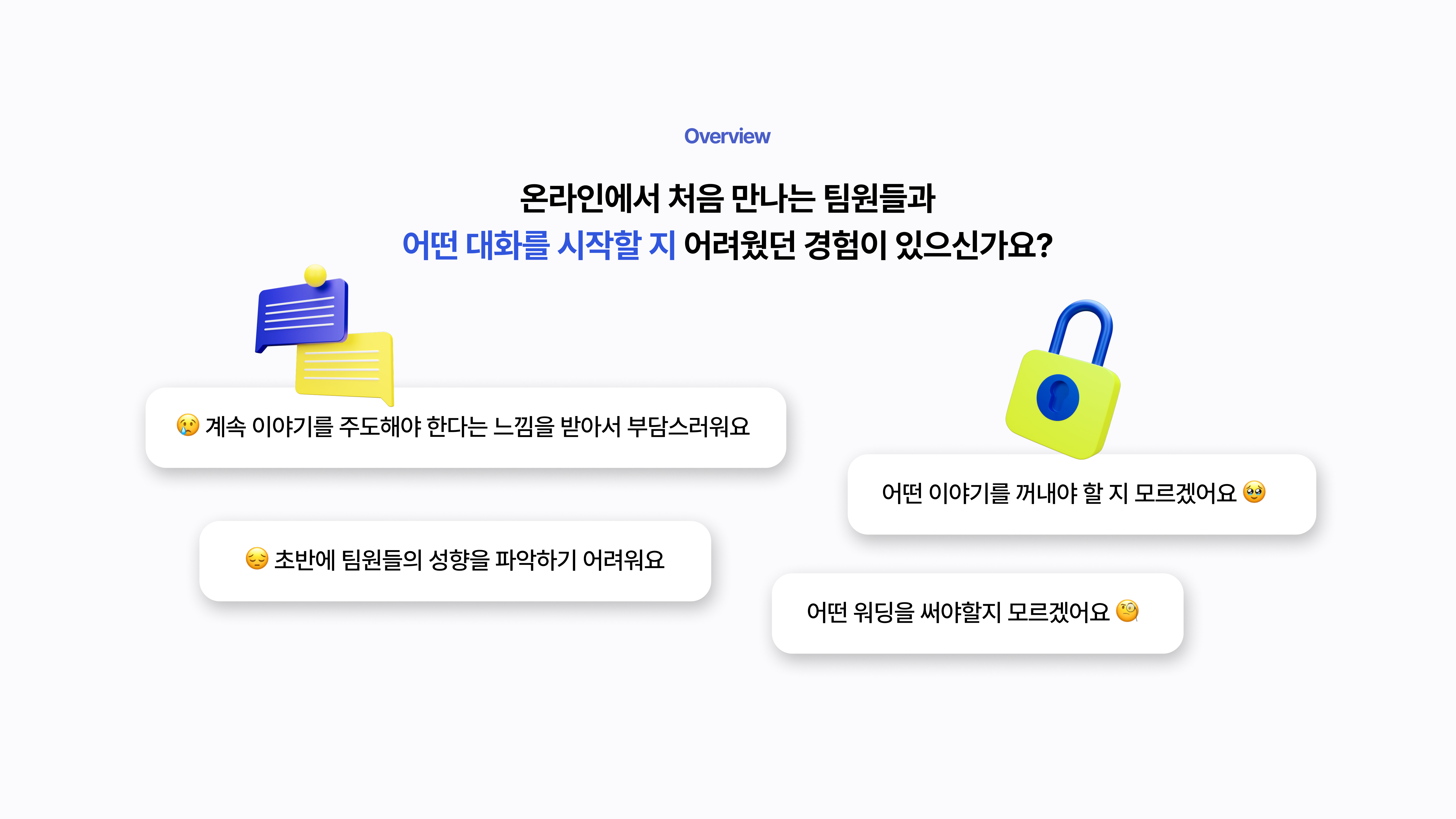 이후 진행된 설문조사를 통해 다양한 분들이 새로운 모임에 참여하는 자리에서 대화를 이끌어 나가는것에