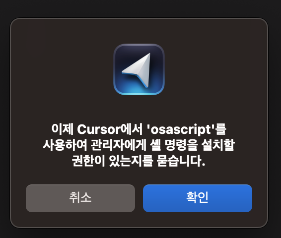 'cursor command' 설치 이후에는 터미널에서 `cursor .` 명령어가 `vscode .` 처럼 정상적으로 동작하는것을 확인 할 수 있었습니다.